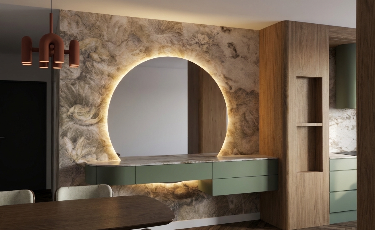 Ściana między przedpokojem a salonem miała tworzyć efekt wow. Zaproponowałam tutaj klimatyczną tapetę oraz duże lustro z podświetleniem led. Szafkę przy lustrze można wykorzystać na tak zwaną toaletkę. Jest to świetny zabieg, który nie tylko tworzy efekt wow, ale także super doświetla wnętrze dlatego, że umieszczone jest na wprost okna balkonowego i odbija światło.