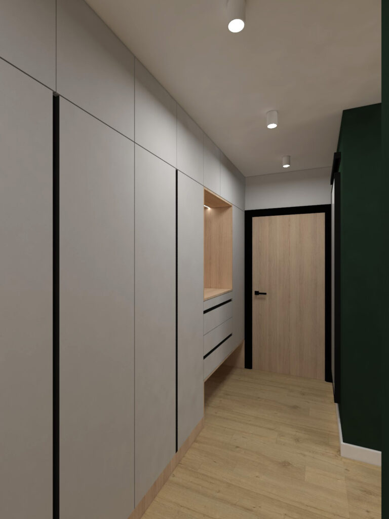 SZARO DREWNIANE MEBLE W PRZEDPOKOJU Z CZARNYMI UCHWYTAMI PEKA SCHUCO | PROJEKTOWANIE WNĘTRZ REDA