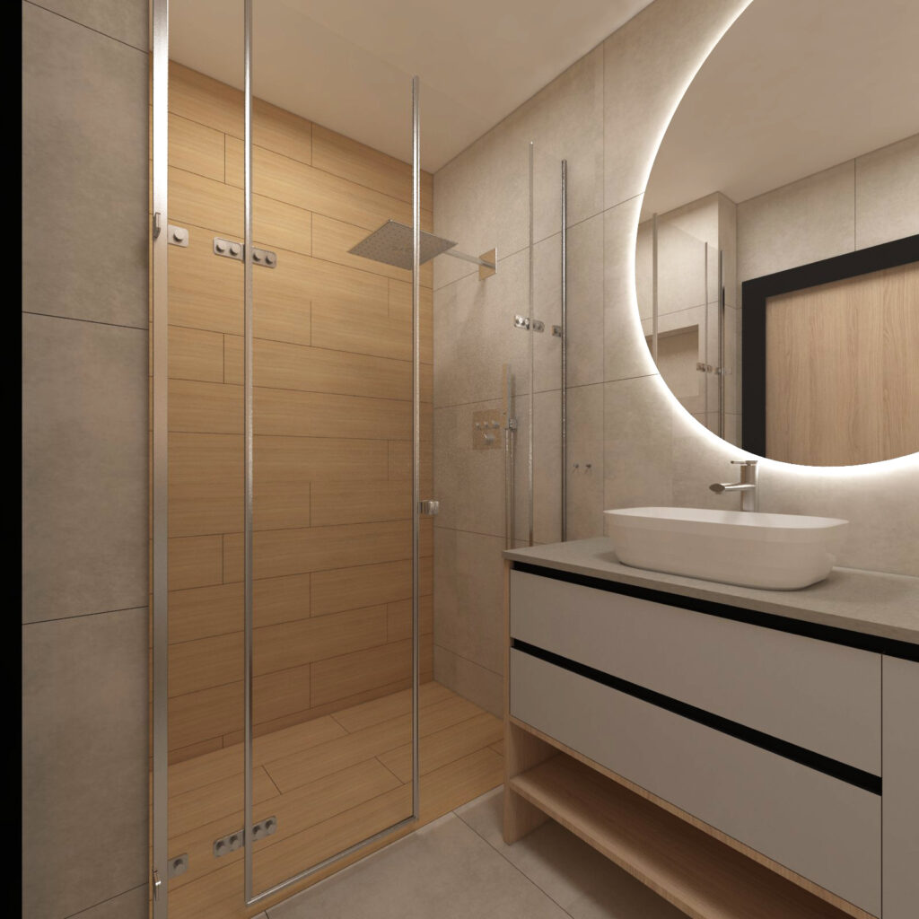 MINIMALISTYCZNA ŁAZIENKA W DREWNIE I SZAROŚCI